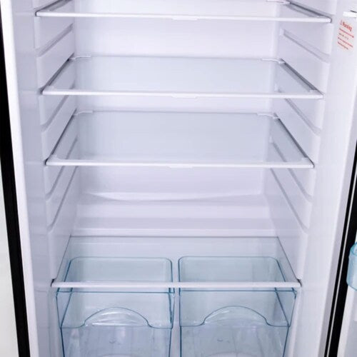 - Sealed glass shelves, as well as door bins, are removable and adjustable.