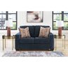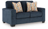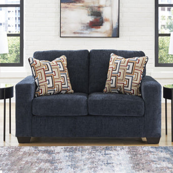Looking to make a bold statement with color? Liven up your living room with this loveseat. Its trend-right navy blue upholstery adds a playful pop of color to your decor. Bold and eclectic accent pillows complete the look. Pairing posh style with everyday comfort, this piece is a welcome addition to contemporary spaces.