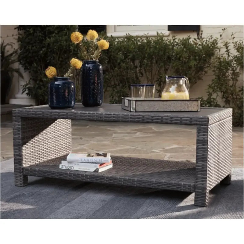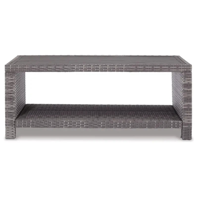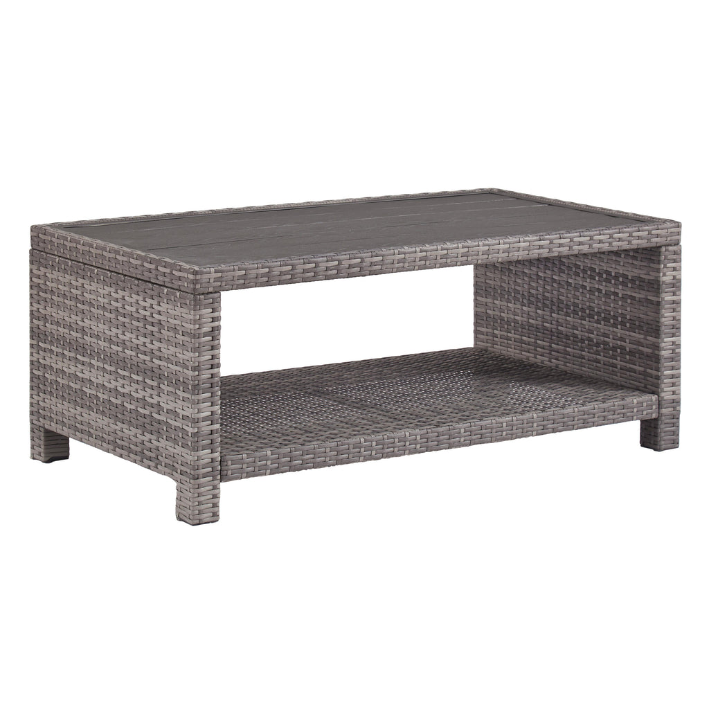 Bring a coastal cool vibe to your outdoor living space with this coffee table. What looks like rattan is actually handwoven resin wicker in gray with all-weather protection. Rest assured, the planked wood-look top is water and stain resistant. Concealed aluminum frame is powder coated for seasons of carefree use.