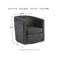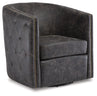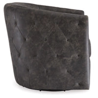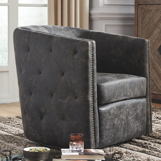 Barrel back and loose seat cushionUpholstered in distressed black faux leatherFoam cushions wrapped in thick poly fiberTufted sidesAntiqued brass-tone nailhead detailMetal swivel base