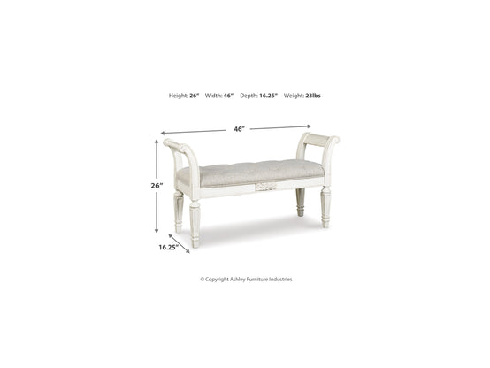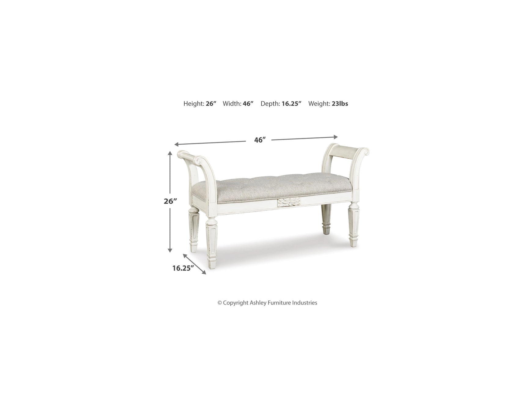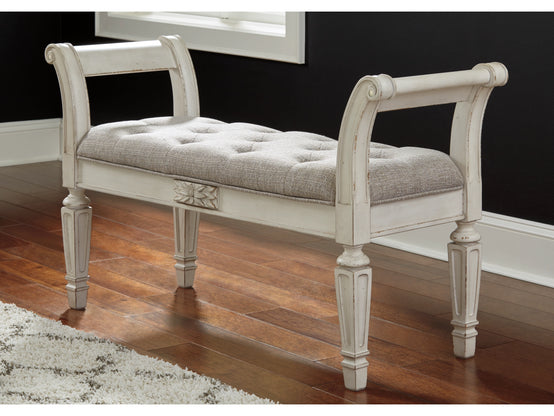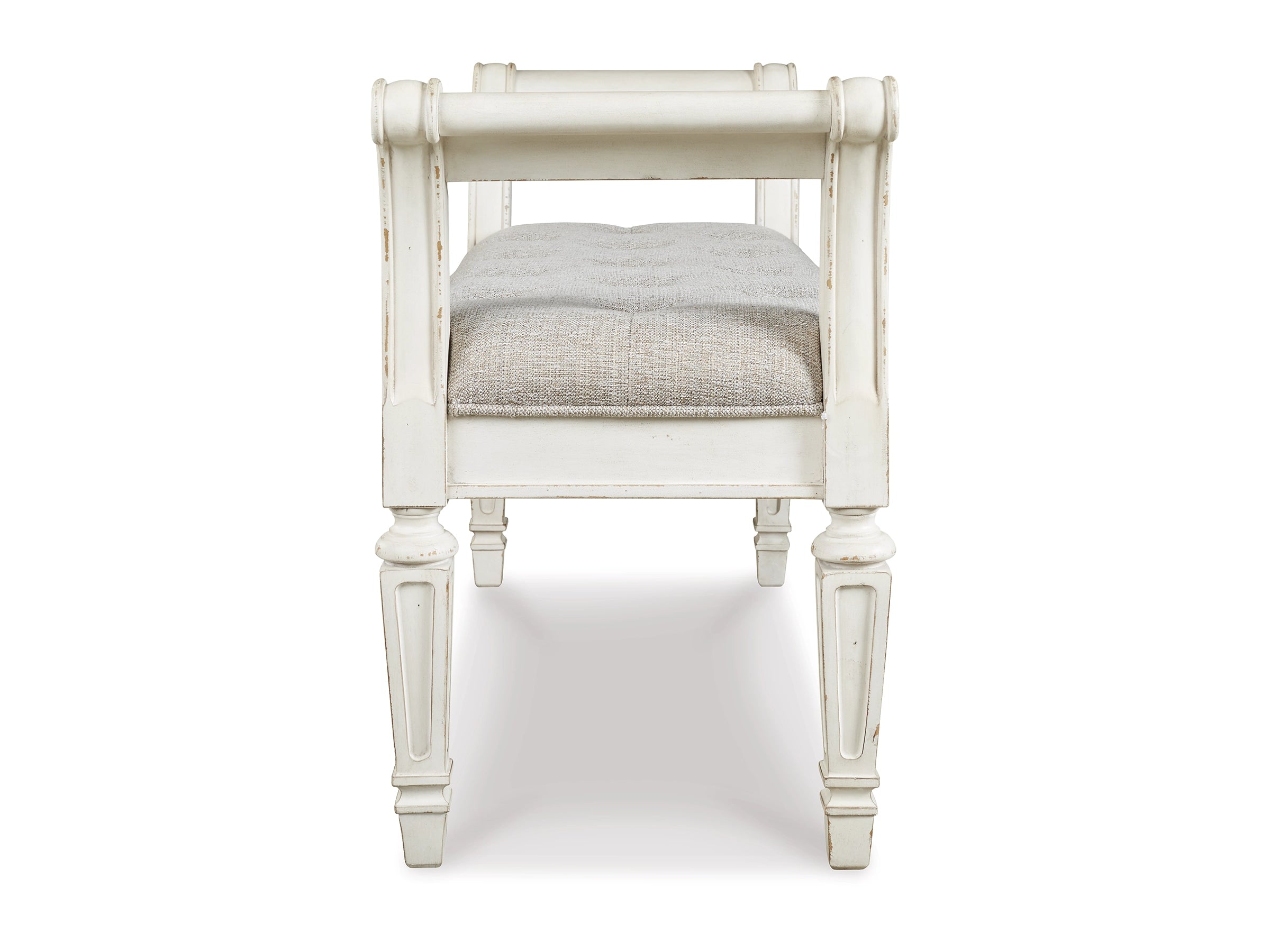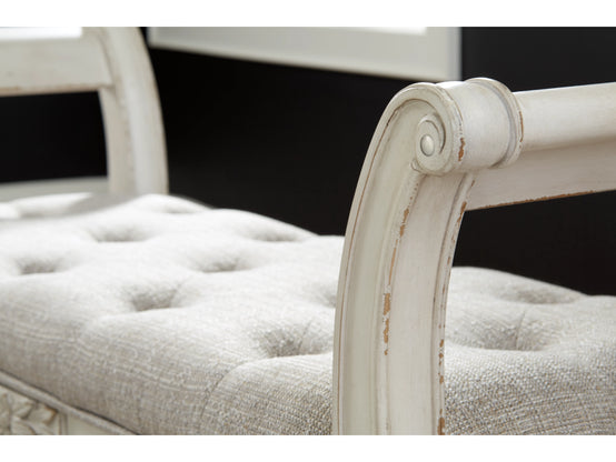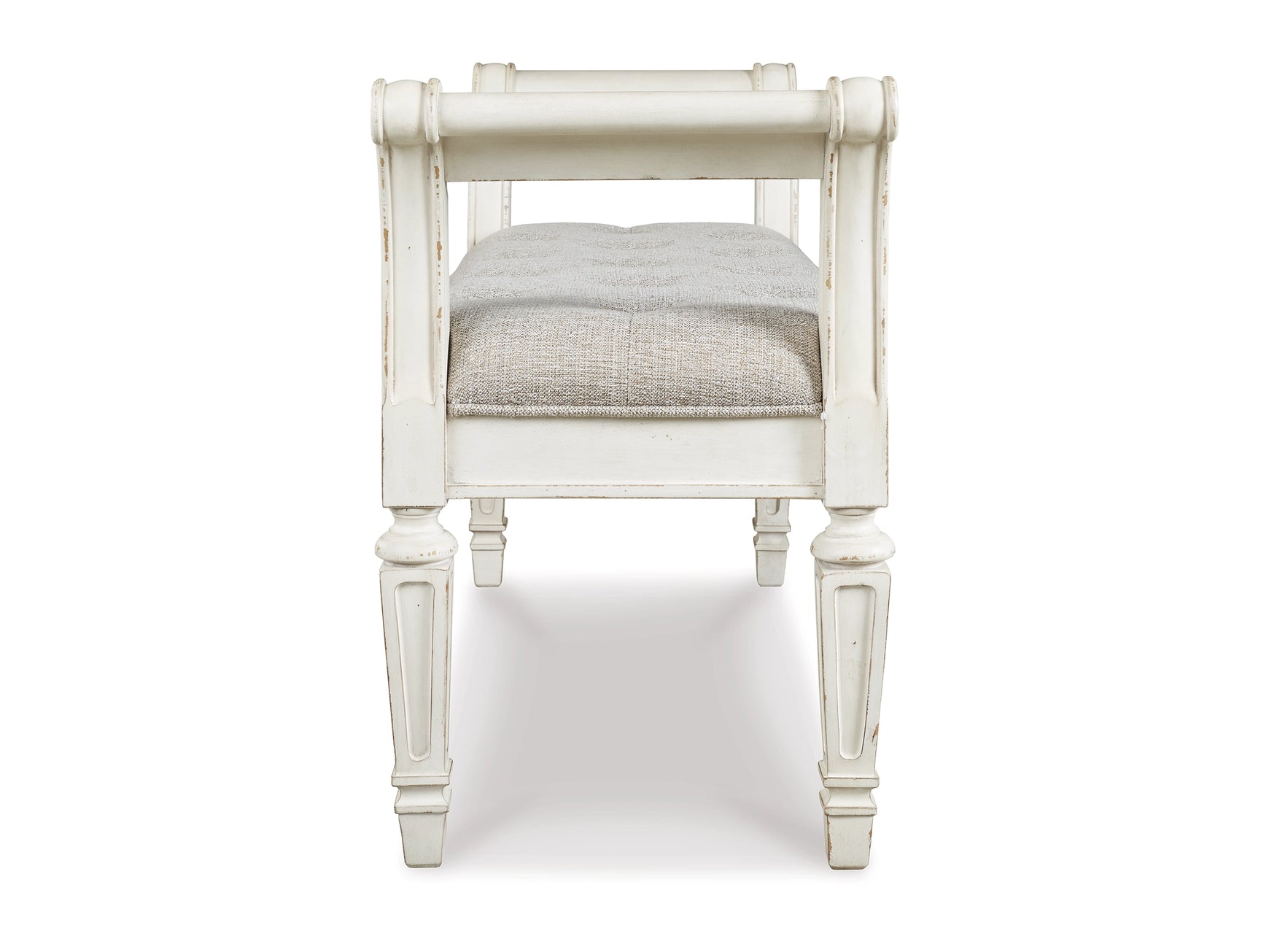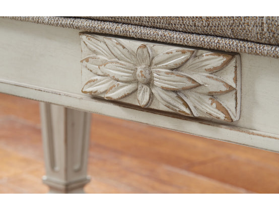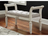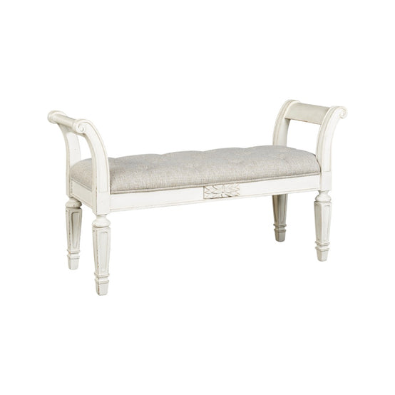 A classic to be cherished for years. This accent bench is a timeless treasure. Quality wood frame flaunts an antiqued white finish. Touches like the scrolled arms and floral applique give this piece so much character. You’ll love sitting on the cushiony, tufted seat in all of its sophistication.