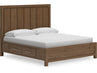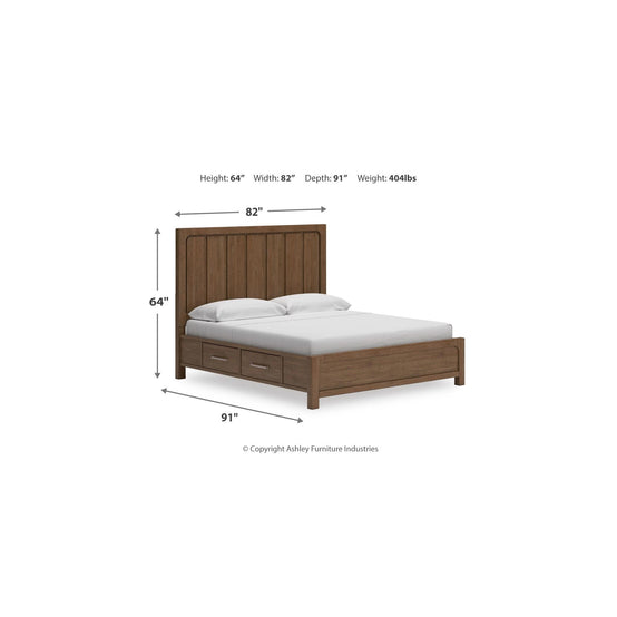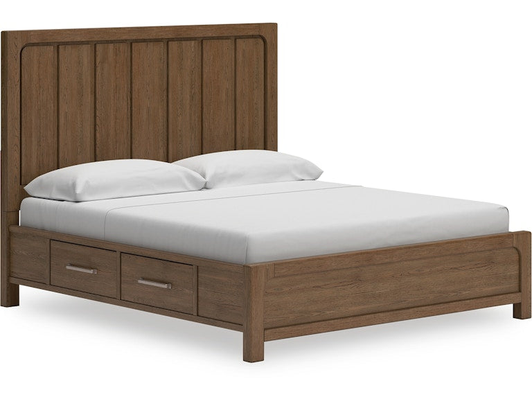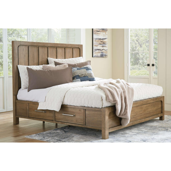 - Includes panel headboard, footboard with roll slats, storage rails and storage drawers
