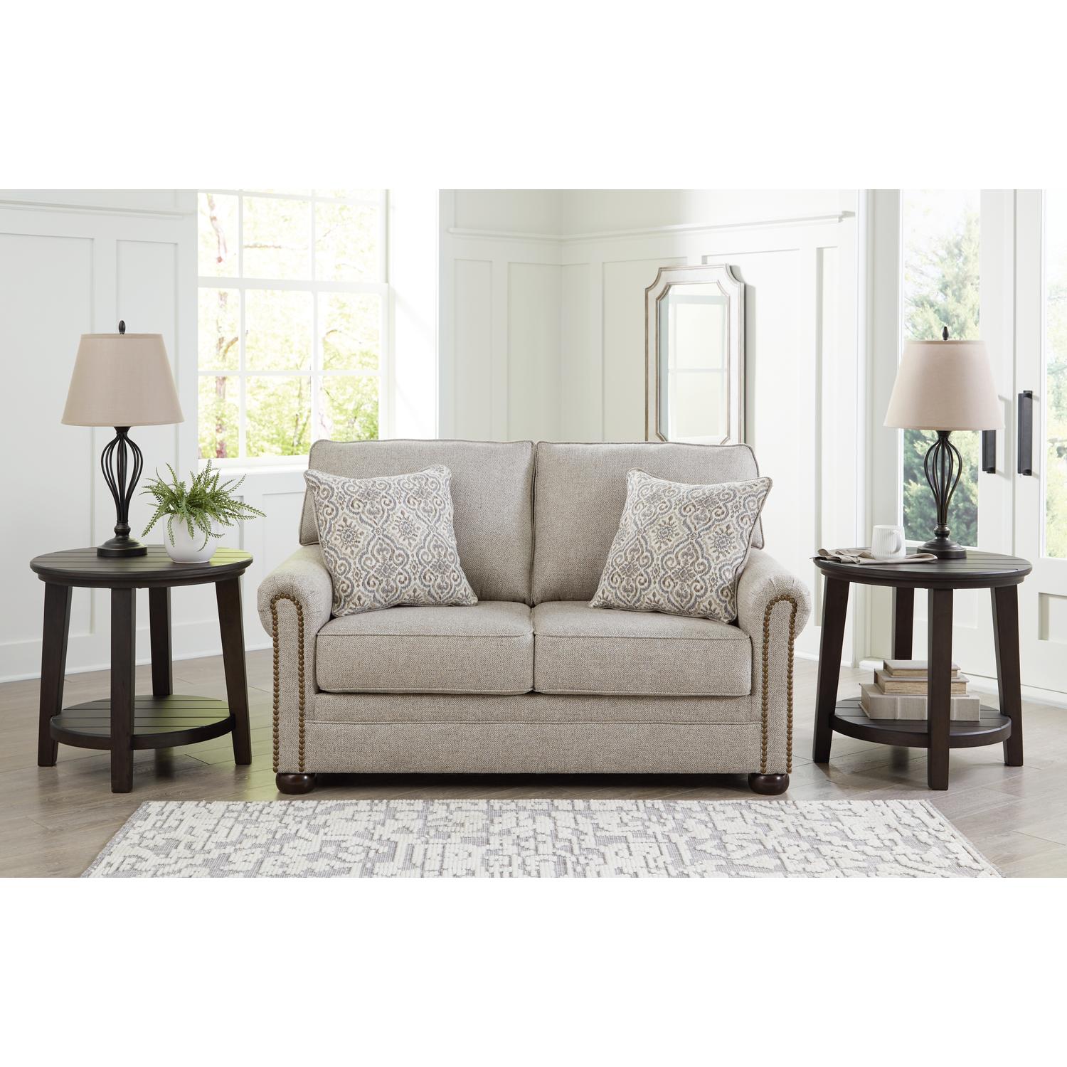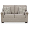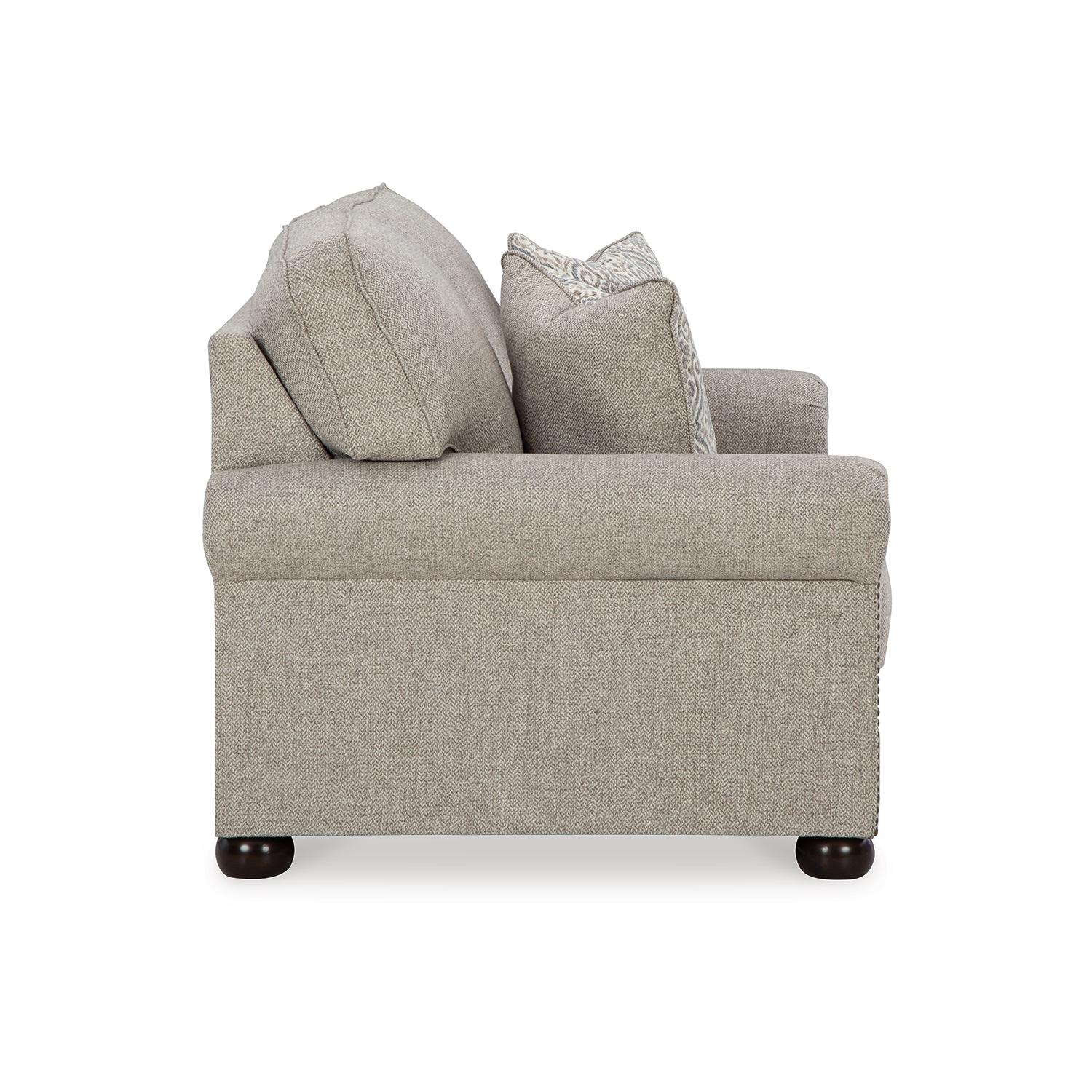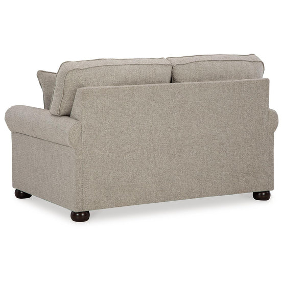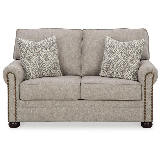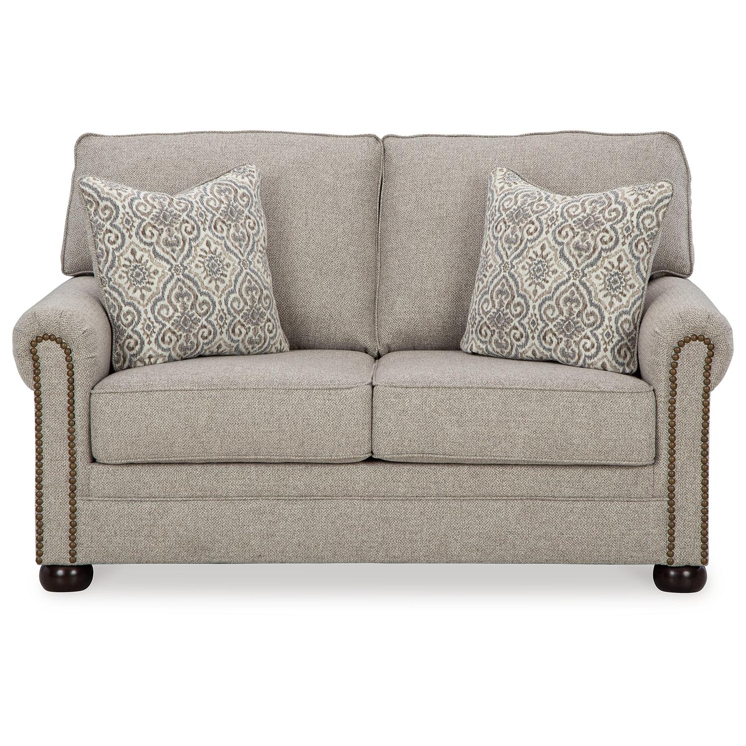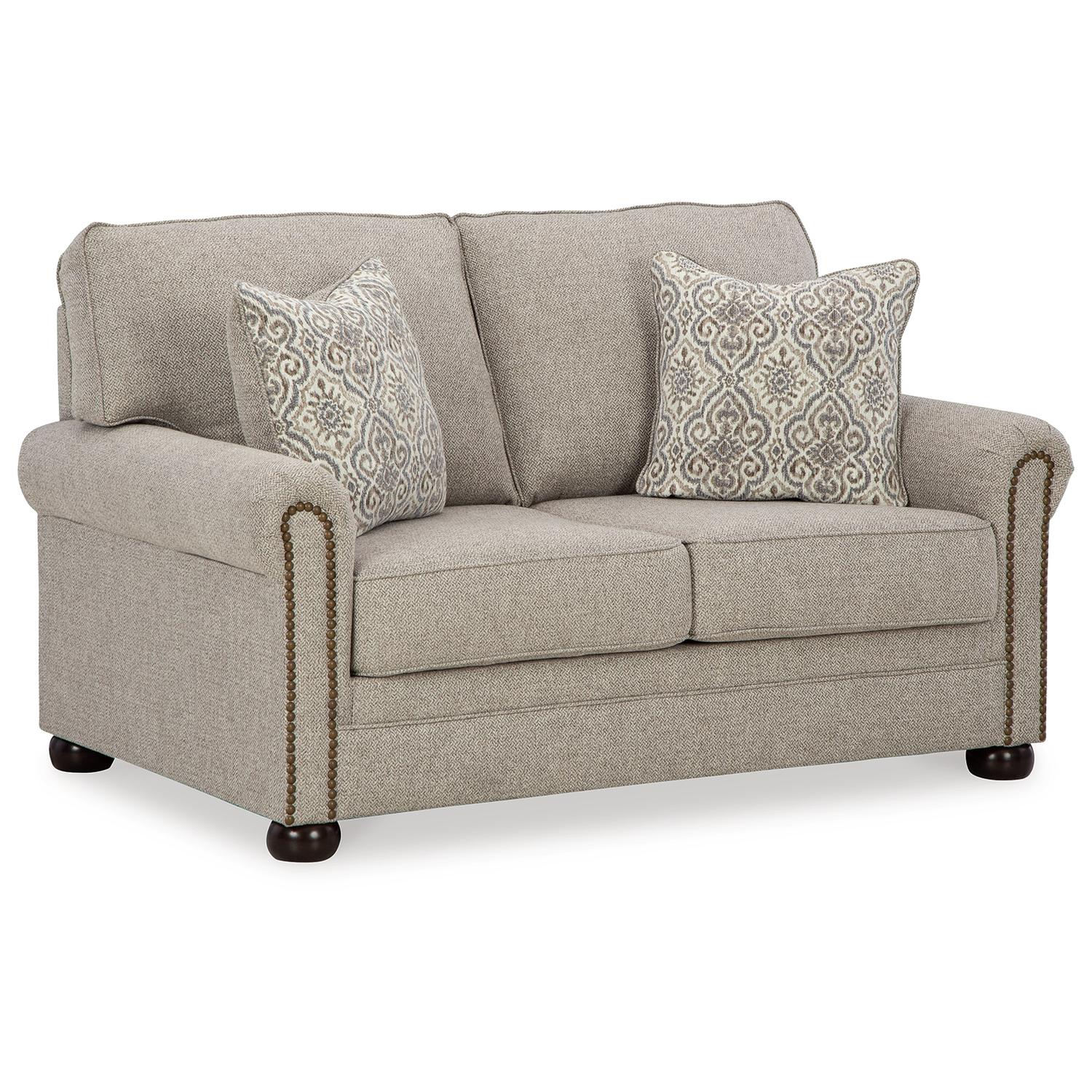 Inspired by the past but rooted firmly in the present, this loveseat complements your transitional seating area. Its versatile upholstery is delightfully detailed for a subtle herringbone effect. Designer touches like decorative nailhead trim and bun legs add traditional character. With this loveseat's reliable style and comfort, all you need to do is sit back and relax.
