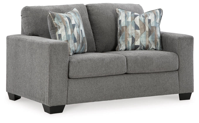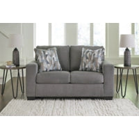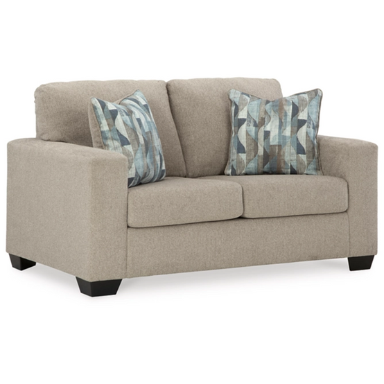 You’re in for a neat treat with this loveseat. Its comfy seats are covered in soft, textural upholstery, and the wide track arms are eager to support your quest for total relaxation. Distressed abstract toss pillows bring a fresh breath of contemporary style while accentuating the loveseat's color.