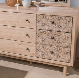 Inspired by natural beauty, refined to perfection. This dresser brings cozy outdoor vibes to your bedroom with its warm and inviting golden rustic finish. Handles in an antiqued gunmetal hue adorn the six drawers on its framed front, adding an industrial touch to the simple, streamlined design.