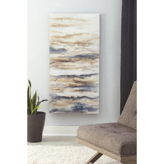 Gallery wrapped canvasHand painted in shades of blue and tanDue to hand-painting, no two will be exactly the sameD-ring bracket hangerHang vertically or horizontallyClean with a soft, dry cloth.