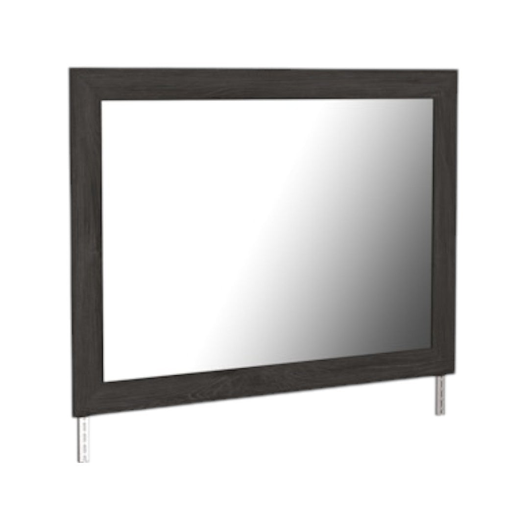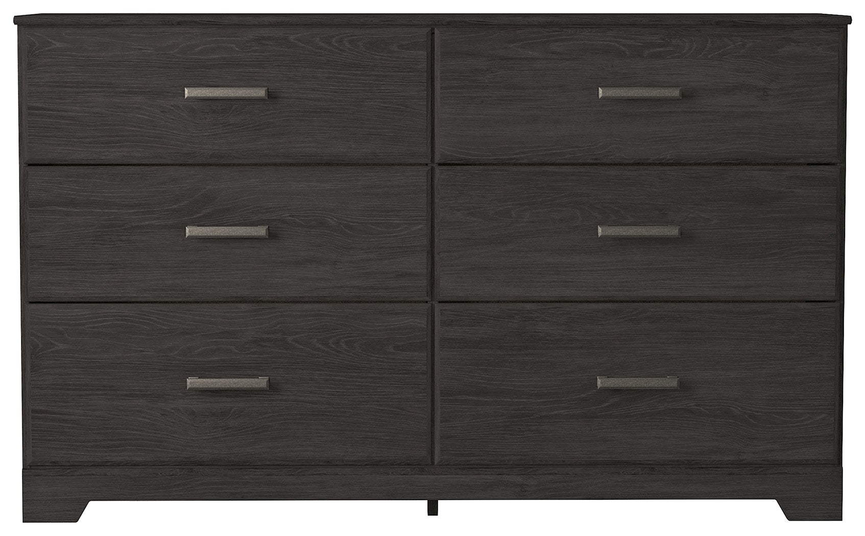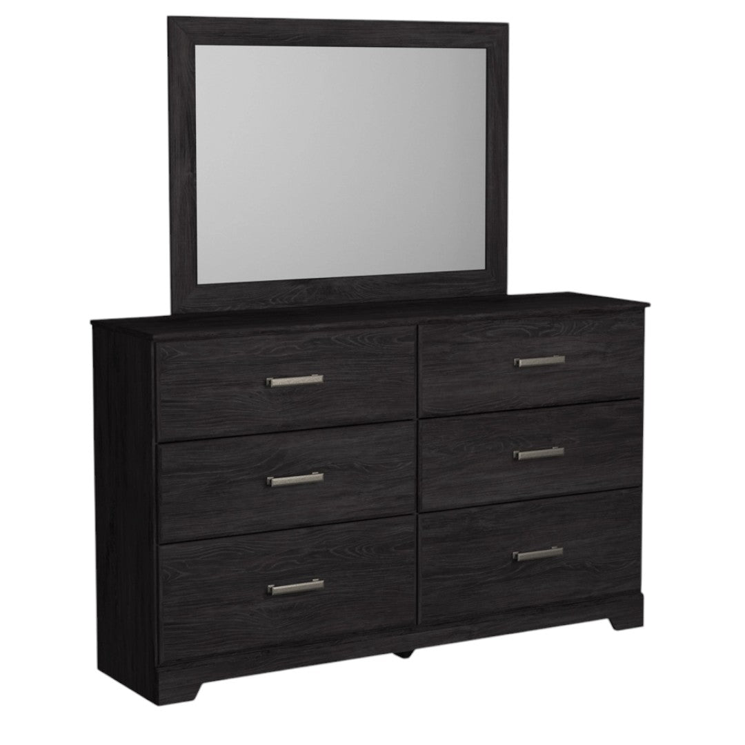 With its clean-lined look and modern attitude, this dresser and mirror is a fresh style awakening. A warm charcoal hue over replicated oak grain easily complements other furniture finishes. Smooth drawer fronts with antiqued pewter-tone handles complete the aesthetic.