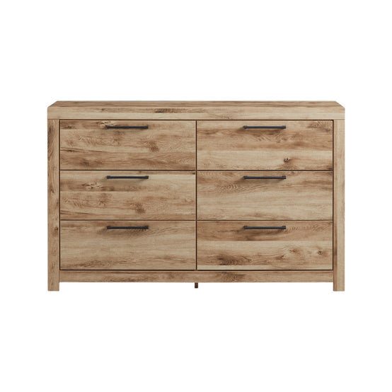 Inspired by natural beauty, refined to perfection. This dresser brings cozy outdoor vibes to your bedroom with its warm and inviting golden rustic finish. Handles in an antiqued gunmetal hue adorn the six drawers on its framed front, adding an industrial touch to the simple, streamlined design.