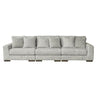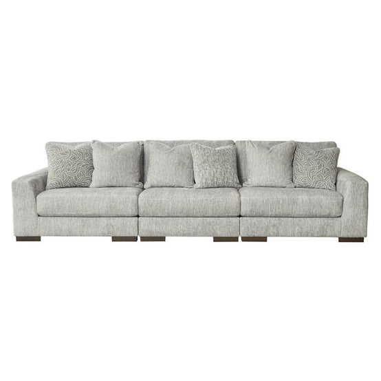 Includes 3 pieces: left-arm facing corner chair, armless chair, and right-arm facing corner chair"Left-arm" and "right-arm" describe the position of the arm when you face the pieceCorner-blocked frameReversible cushionsHigh-resiliency foam cushions wrapped in poly fiberAccent pillows includedPillows with feather-fiber fillPewter polyester upholsteryExposed feet with faux wood finishPlatform foundation system resists sagging 3x better than spring system after 20,000 testing cycles by providing more even supportSmooth platform foundation maintains tight, wrinkle-free look without dips or sags that can occur over time with sinuous spring foundationsEstimated Assembly Time: 10 Minutes