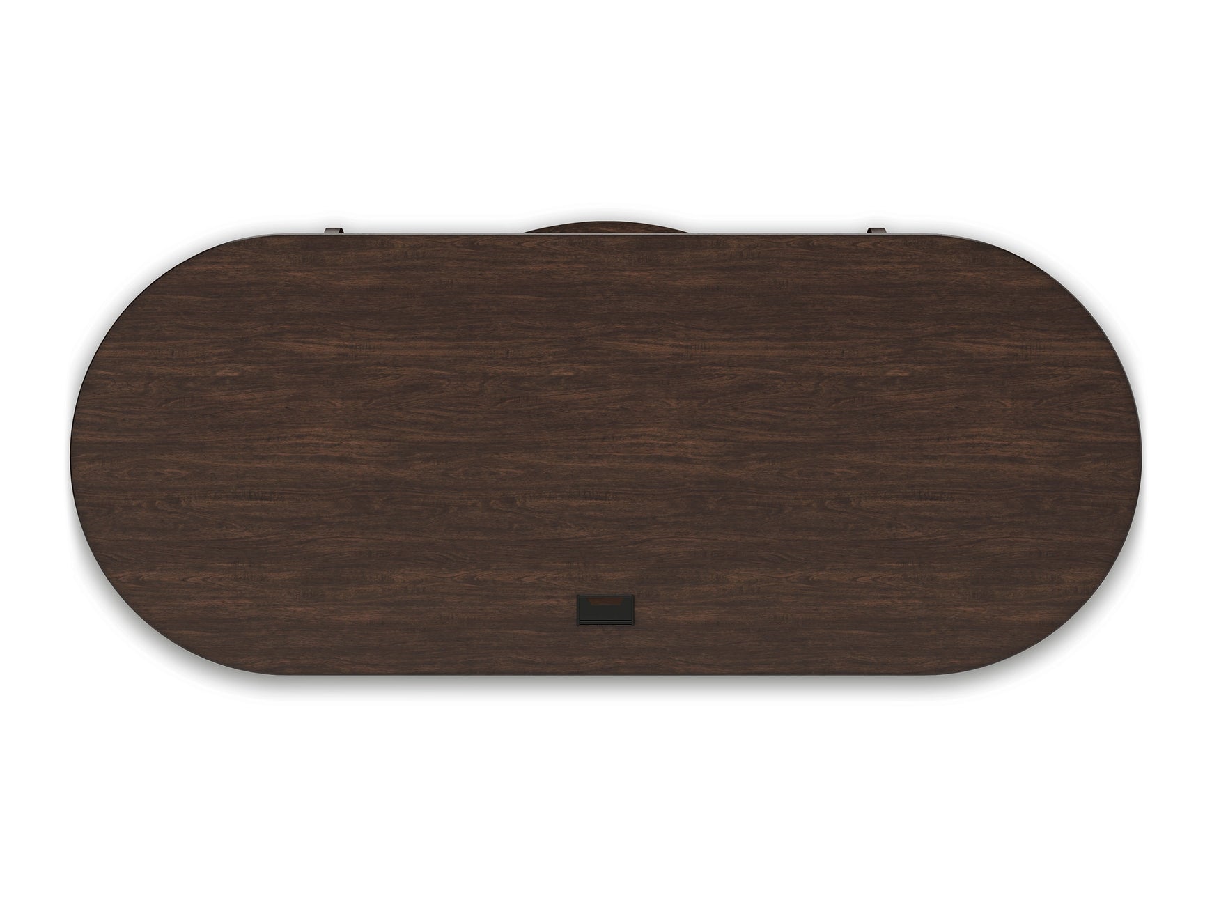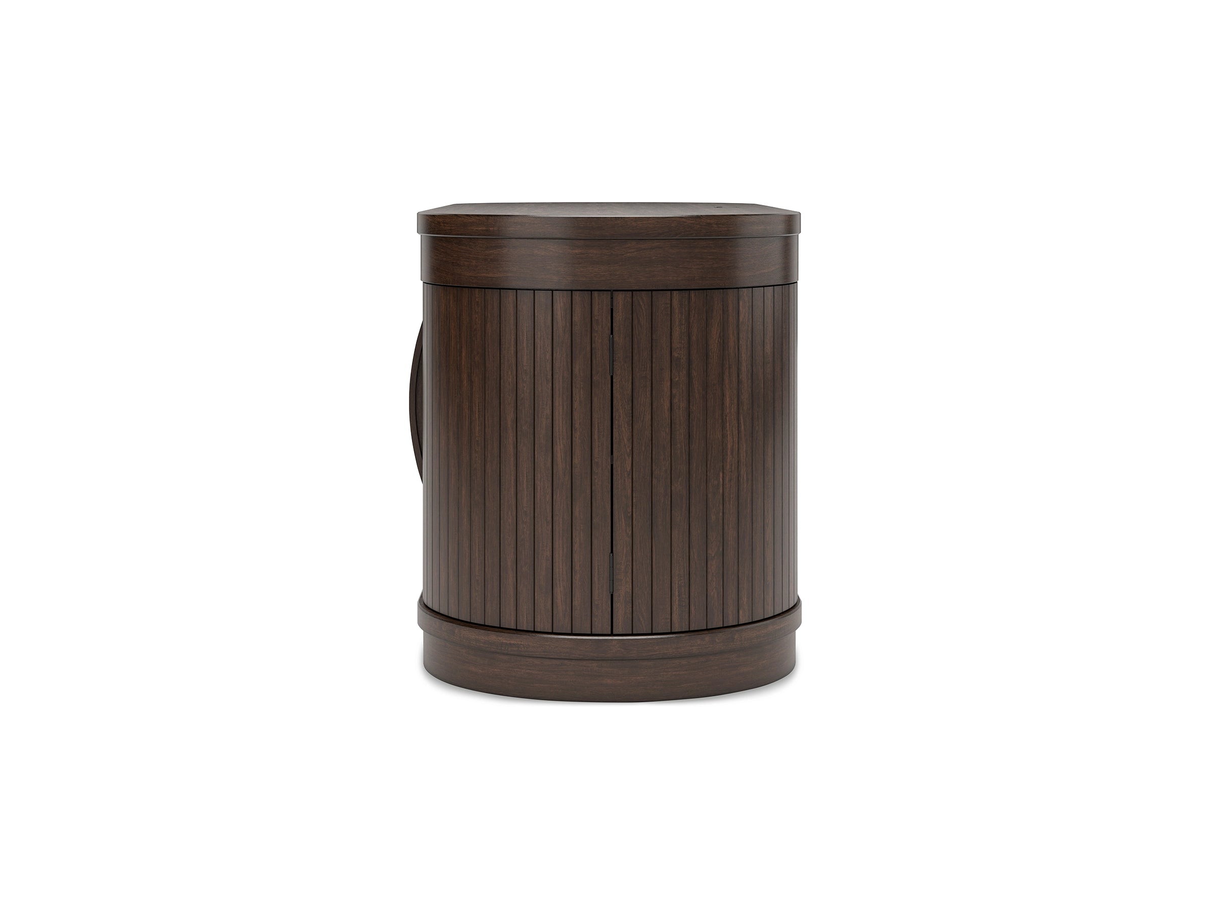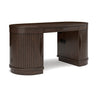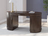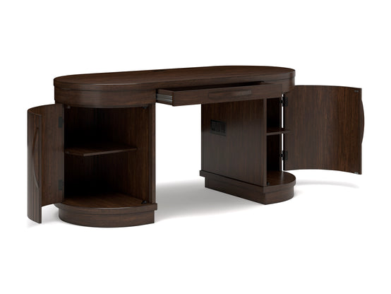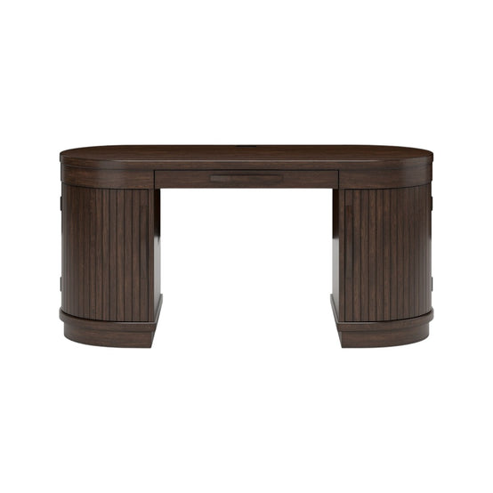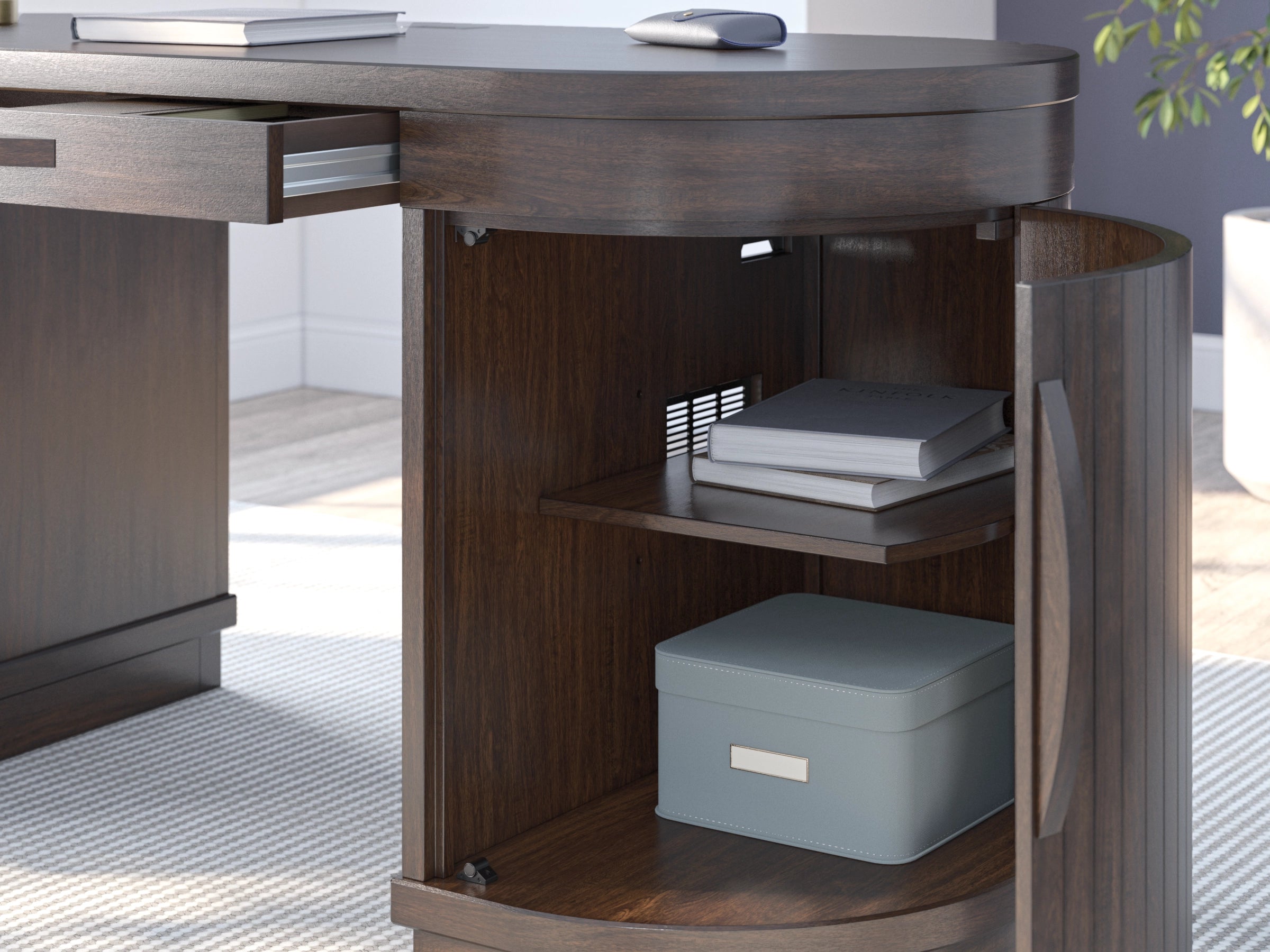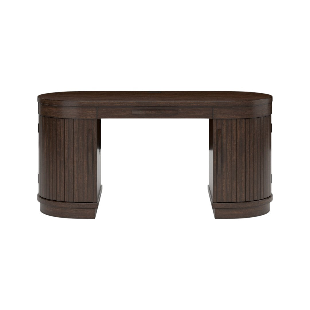 This home office desk is perfectly modern in every way. Finished on both sides in a rich wood tone, it can be floated in a room or used as a divider. Two half round door cabinets, each with an adjustable shelf, deliver a well-organized space for work-from-home professionals. It's a striking study in upscale contemporary form and function.