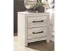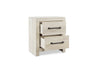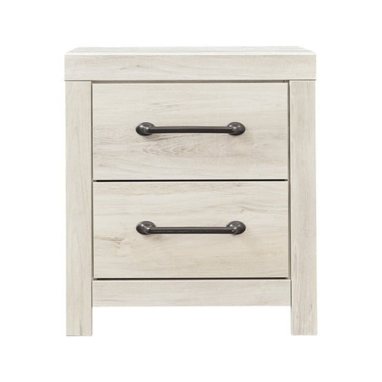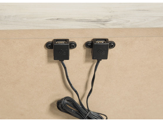 Made of engineered wood (MDF/particleboard) and decorative laminateWispy white finish over replicated oak grain with authentic touchLarge-scale hardware with dark finish2 smooth-gliding drawersDrawers lined with faux linen laminate for finished aesthetic2 slim-profile USB charging stationsPower cord included; UL ListedEstimated Assembly Time: 5 Minutes