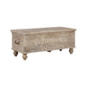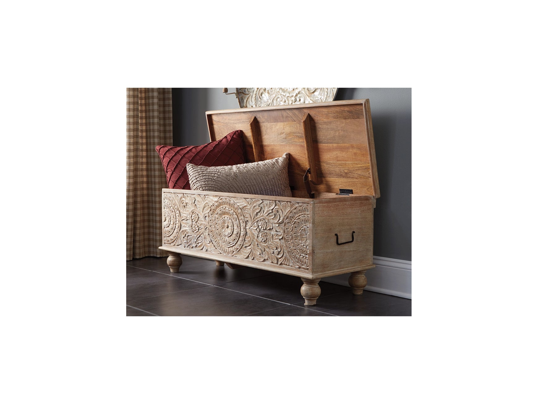 Merging practical storage with an exotic sense of flair, this storage bench stands out from the crowd in an intriguing way. Its grainy wood is beautified with an antique white finish, and the ornamental medallion carvings are pure artistry.