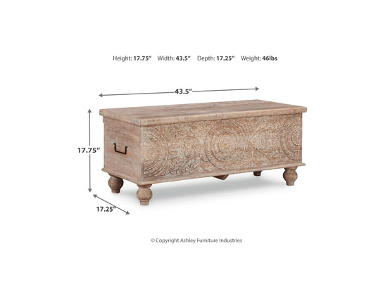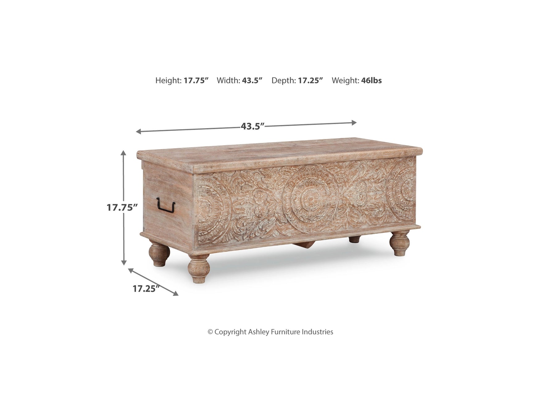 Made of solid woodAntique white finishBlack metal handlesHand-carved stylingHinged top with underlying storageEstimated Assembly Time: 15 Minutes