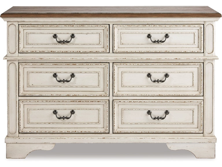 Elevating the art of traditional cottage styling, this dresser and mirror set is your dream bedroom retreat realized. This brilliantly crafted bedroom ensemble wows with dramatic scalloped details and an antiqued two-tone aesthetic, blending a chipped white with a distressed wood finished top for added charm. Framed drawer fronts and decorative corbels add refinement, while bail pulls in a dark bronze-tone finish lend a classic touch.