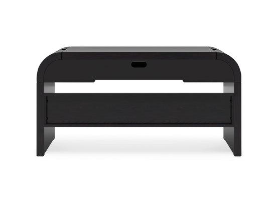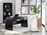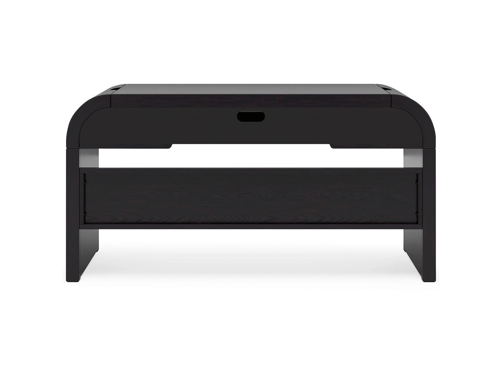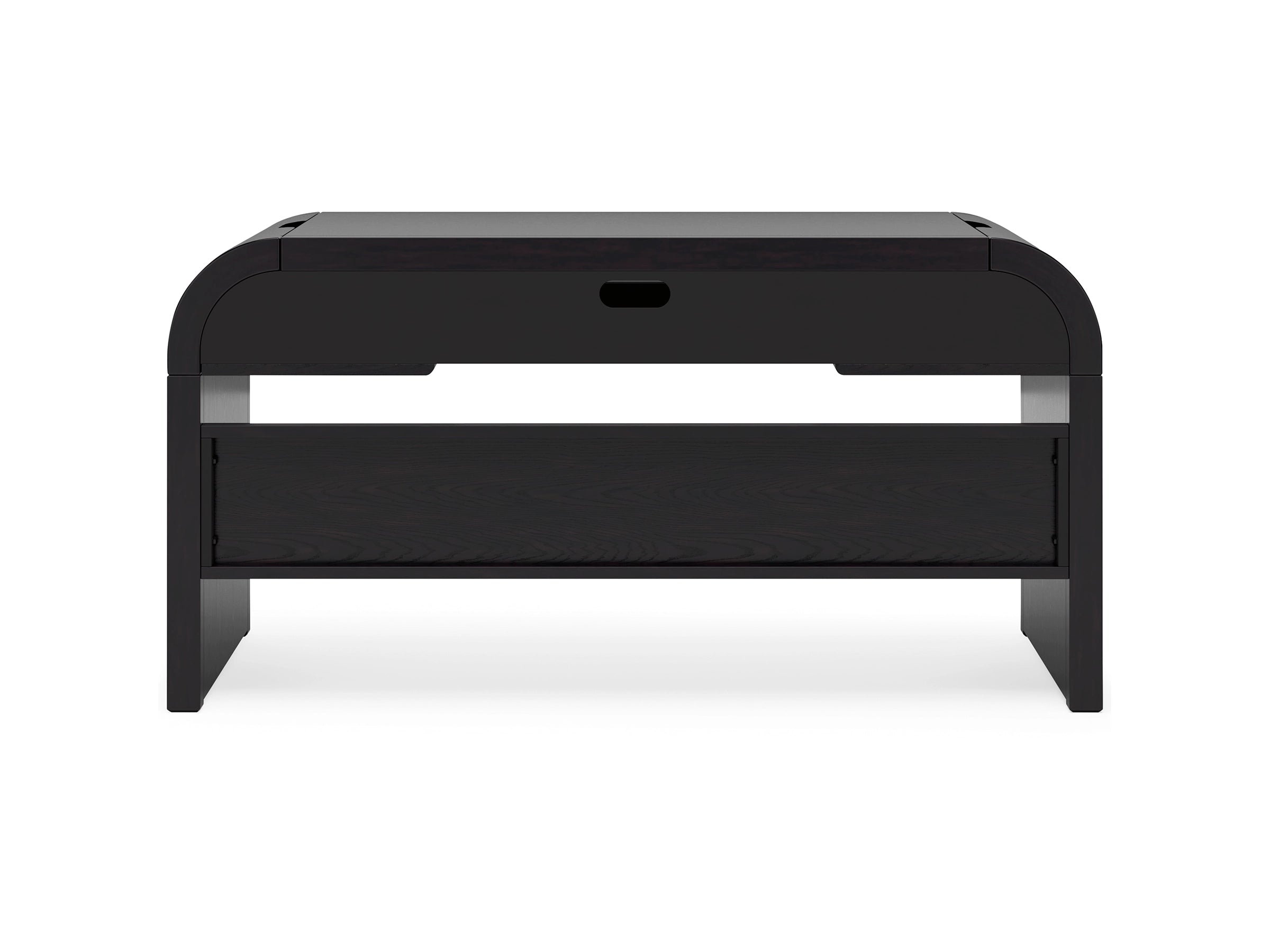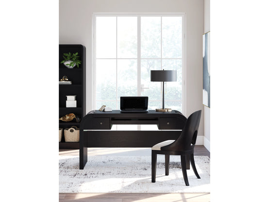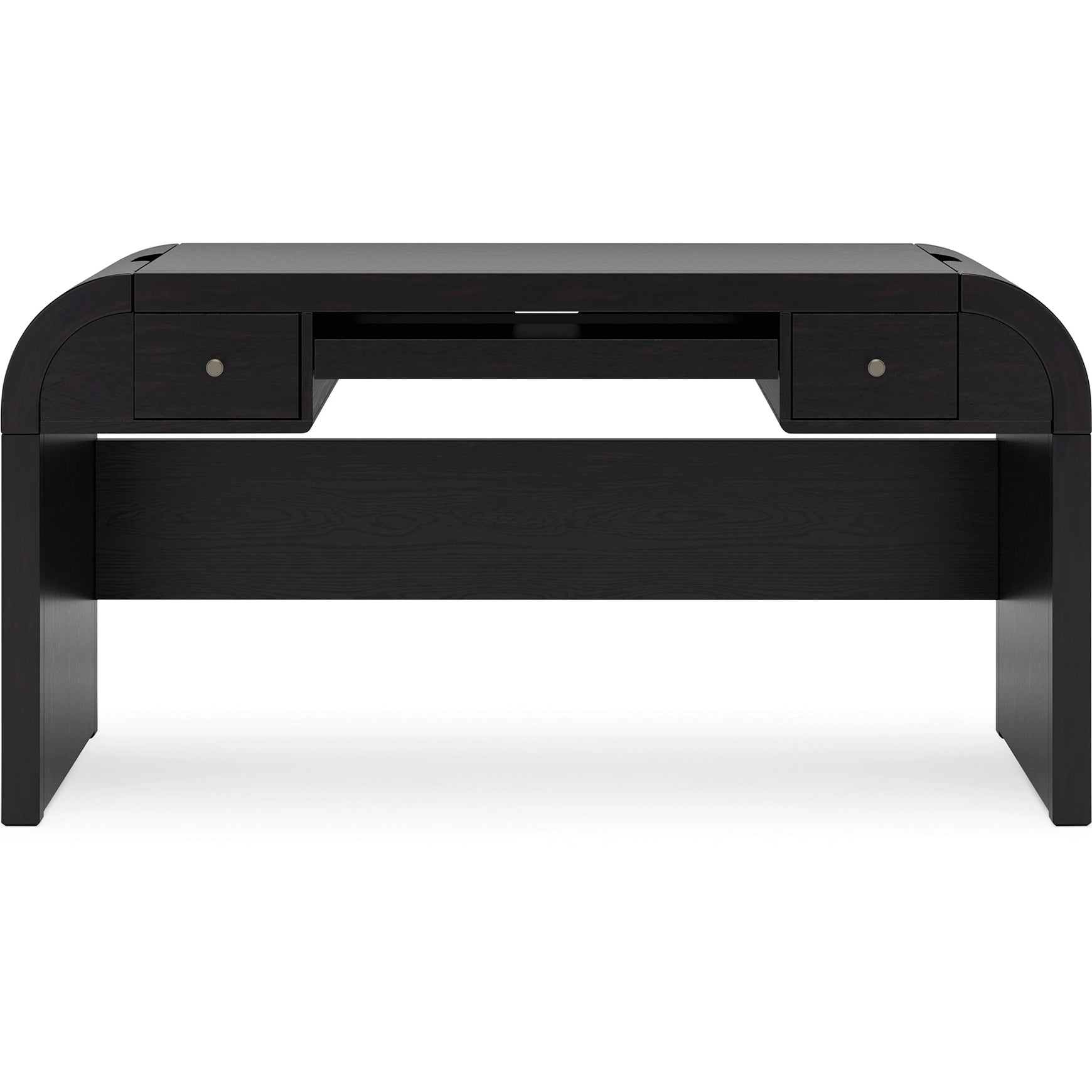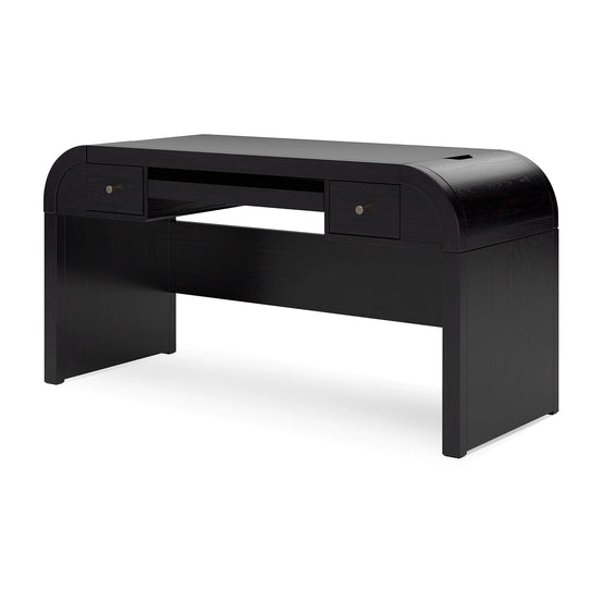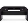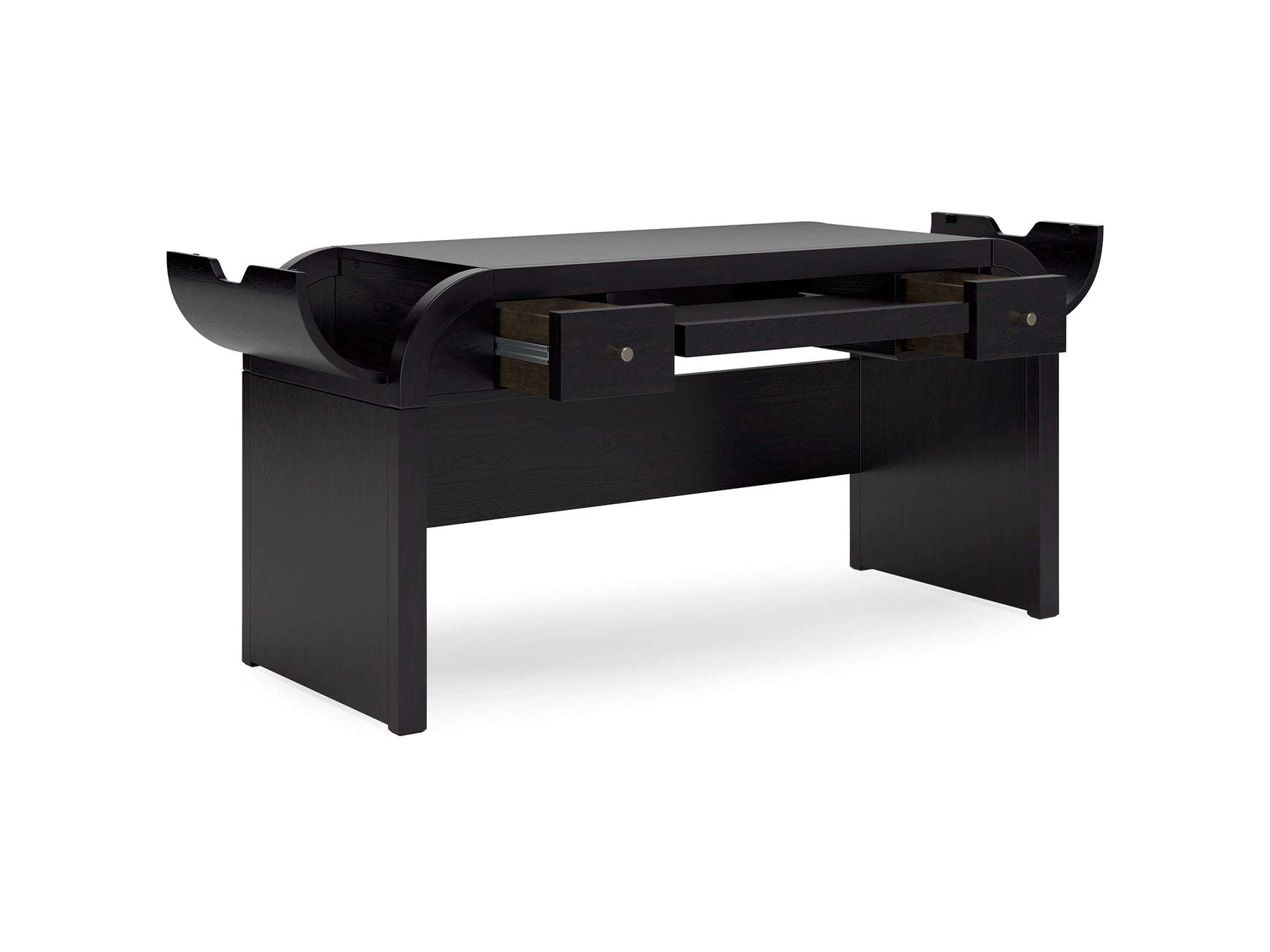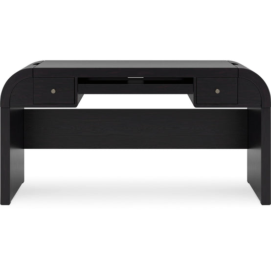 Inspired by art deco design, this softly shaped home office desk makes a lasting impression in a simply stunning way. Its magnificent curved silhouette is enhanced by a rich layered black finish on the textured wood grain surface. Complete with ample storage, a pull-out keyboard tray and USB charging, this is the all-in-one piece you’ve been looking for to elevate your contemporary workspace decor.