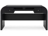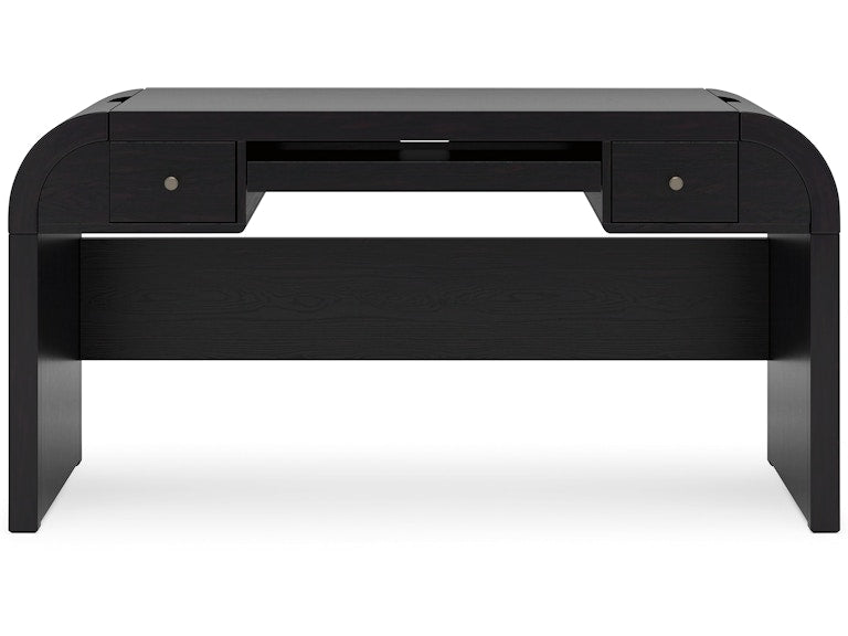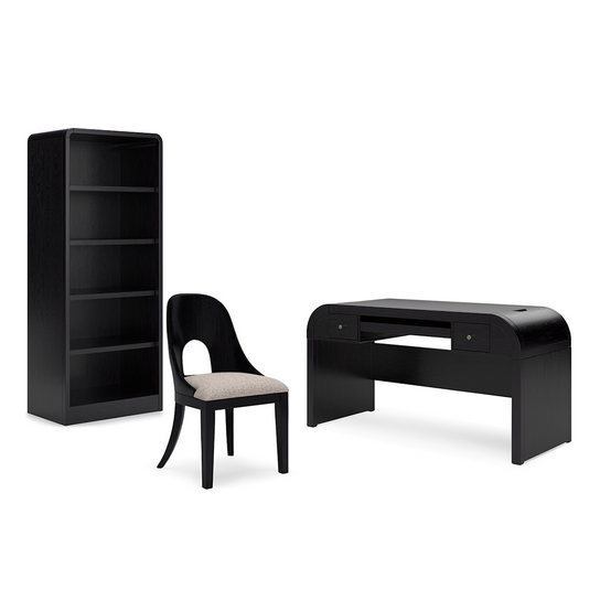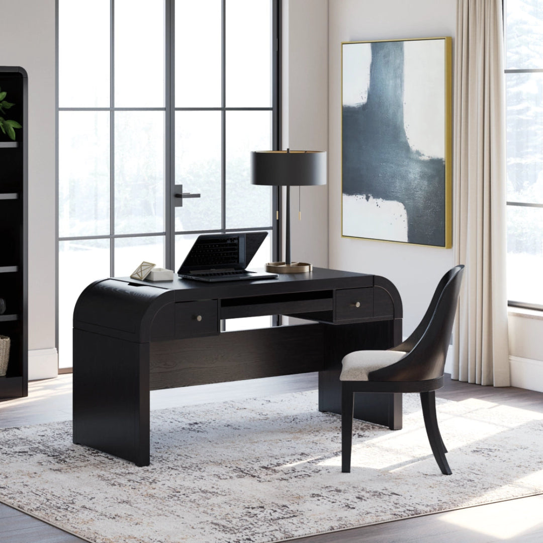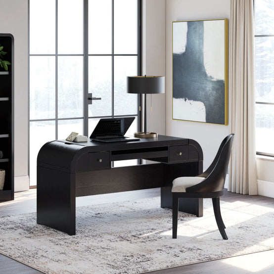 Inspired by art deco design, this home office package makes a lasting impression in a simply stunning way. Its magnificence is enhanced with a rich layered black finish over a textured wood grain finish. This is the statement-making set you’ve been looking for to elevate your contemporary workspace.