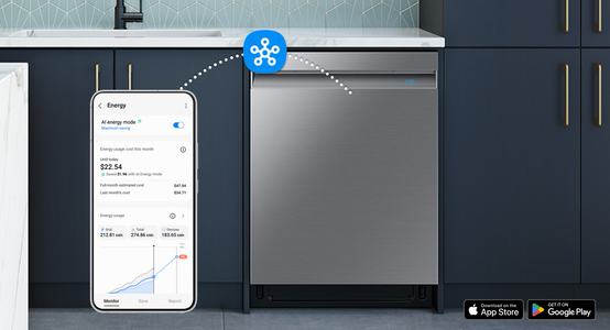 SmartThings Energy lets you monitor and manage your dishwasher's power usage.§ Reduce your energy use by up to 30%† with AI Energy mode≠, all from your phone.