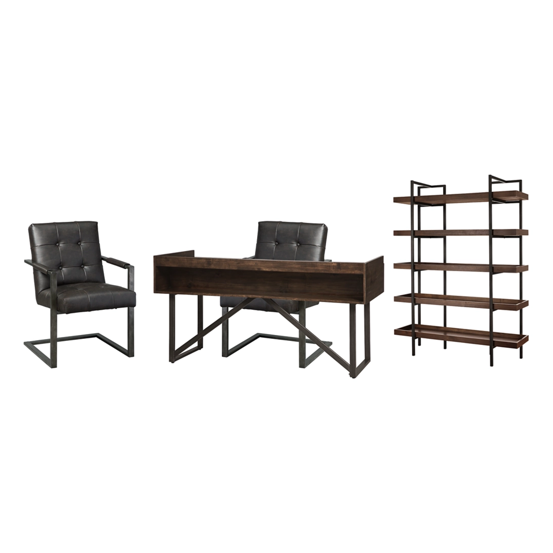 For fans of urban industrial design, this home office set steals the show. The desk and bookcase are crafted with a mix of acacia veneer and wood beautified with an oiled walnut-tone finish. Sleek metal frames and linear accents on the pieces work so well together. The chairs' tufted seats, wrapped in a “weathered” faux leather upholstery, are loaded with retro-chic flair. Gallery-style elements on the pieces stack up to great form and function.
