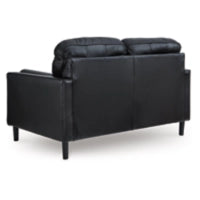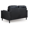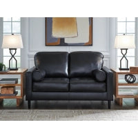This loveseat embodies timeless mid-century elegance with its linear design, sleek track arms and tapered legs. Skillfully matched leather and faux leather upholstery adds a luxurious touch to the overall look. Experience endless style opportunities for today's living spaces.